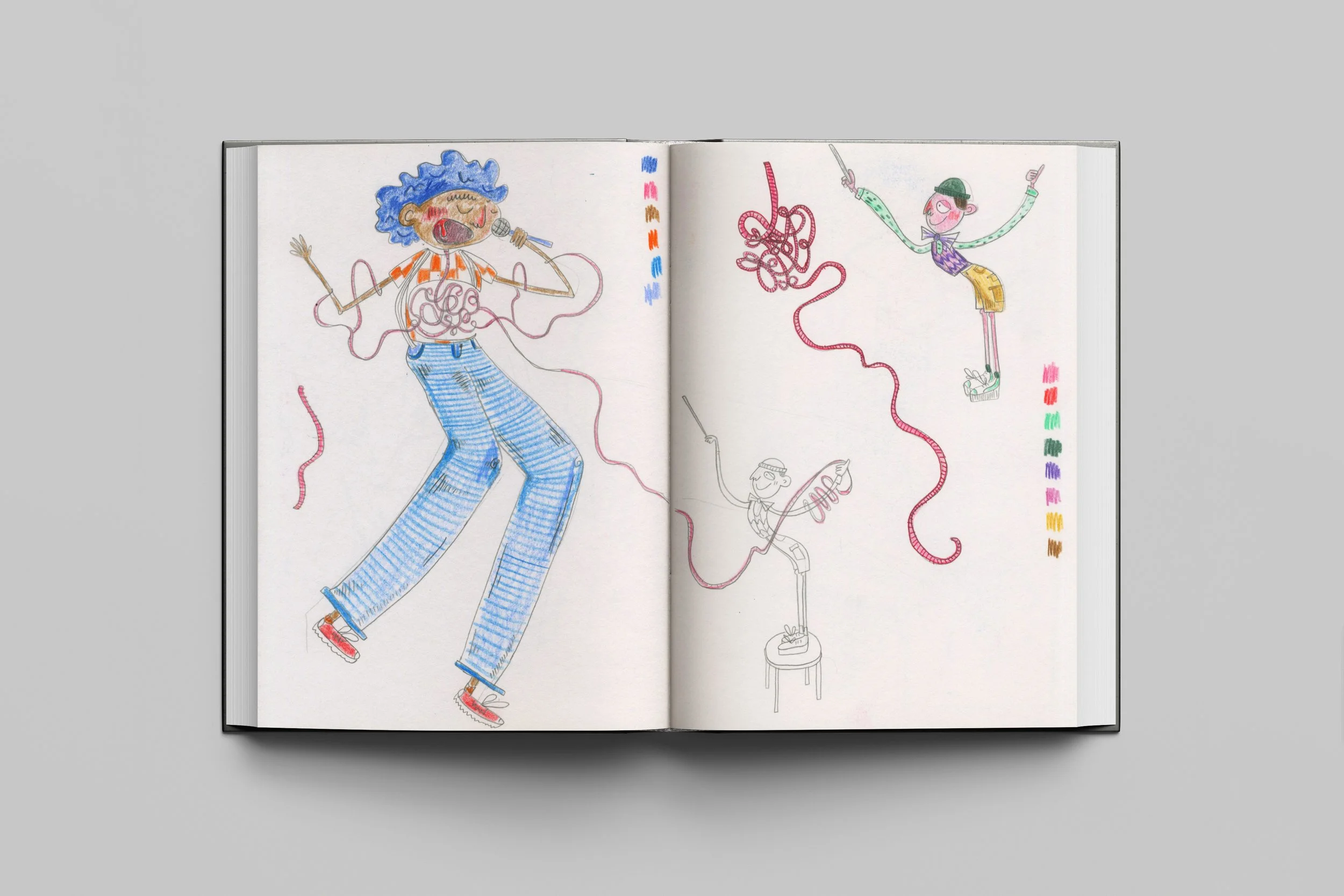 A sketchbook open to two pages with colorful crayon drawings of people jumping and singing, with some doodles of tangled strings and musical instruments.